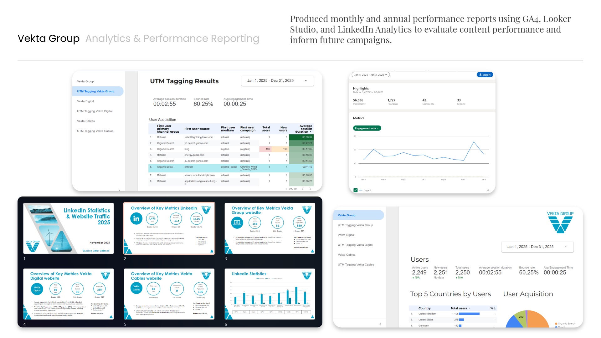 UTM tagging, GA4, Looker Studio, and LinkedIn Analytics turned web and social activity into decision-ready reporting for the CEO and directors.