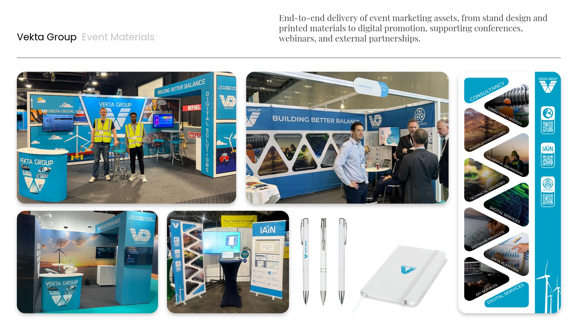 This work showed up in stand graphics, merchandise, and partner collateral for activity with RenewableUK, ORE Catapult, Scottish Enterprise, Cable Technology News, and university partners.